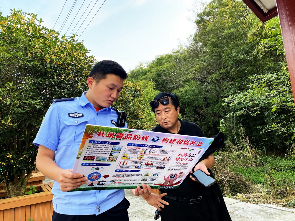 为进一步提高广大群众防范和抵御毒品的能力,10月13日,含山县公安局花山派出所民警抓住游客前往辖区褒禅山、伍子胥古道游玩这一契机,对游客及周边群众开展“对毒品说NO”的禁毒宣传活动。