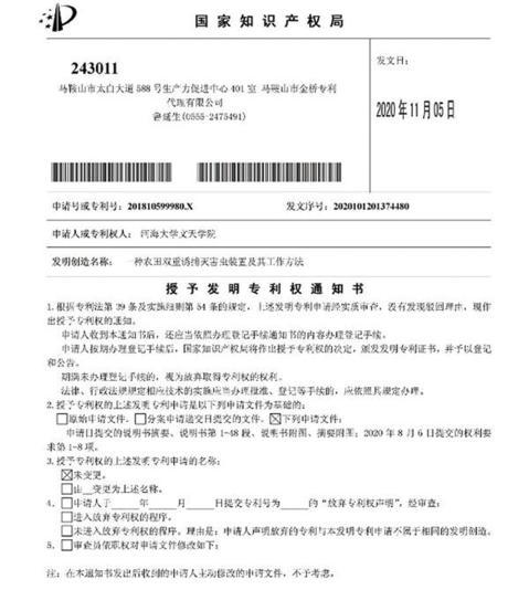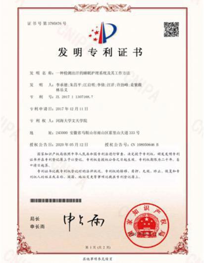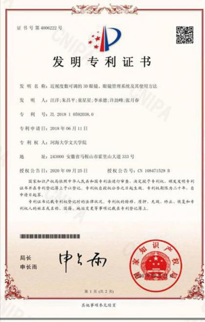 自2020年5月以来,皖江工学院学子发明专利成果迎来了大丰收。5月12日,由朱昌平和林乐义老师指导,李承德、江启明、李倩、汪洋、许劲峰、袁紫薇同学完成的“一种检测出汗的睡眠护理系统及其工作方法(ZL201711307168.7)”获国家授权发明专利;9月21日,由朱昌平老师指导,张月春、童星星、章冉、李承德、江启明、许劲峰、汪洋、方荣华、胡凤城、孙梦秋同学完成的“一种基于无人机检测大坝背面混凝土表面渗流系统及方法(ZL201810613109.0)”获国家授权发明专利;9月25日,由朱昌平老师指导,汪洋、童星星、李承德、许劲峰、张月春同学完成的“近视度数可调的3D眼镜、眼镜管理系统及其使用方法(ZL201810592038.0)”获国家授权发明专利;11月5日,由朱昌平和方正老师指导,程阳、朱从文、王启繁、陈元元同学完成的“一种农田双重诱捕灭害虫装置及其工作方法(ZL201810599980.X)”于获国家授权发明专利。