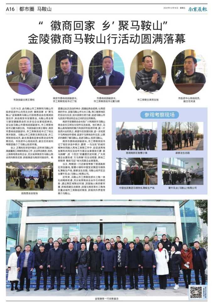 当天,考察团一行还参观考察了慈湖高新区双创基地、智慧小镇和中国宝武集团马钢热轧薄板生产线、薛家洼生态园、马鞍山经开区企业蒙牛乳业(马鞍山)有限公司。