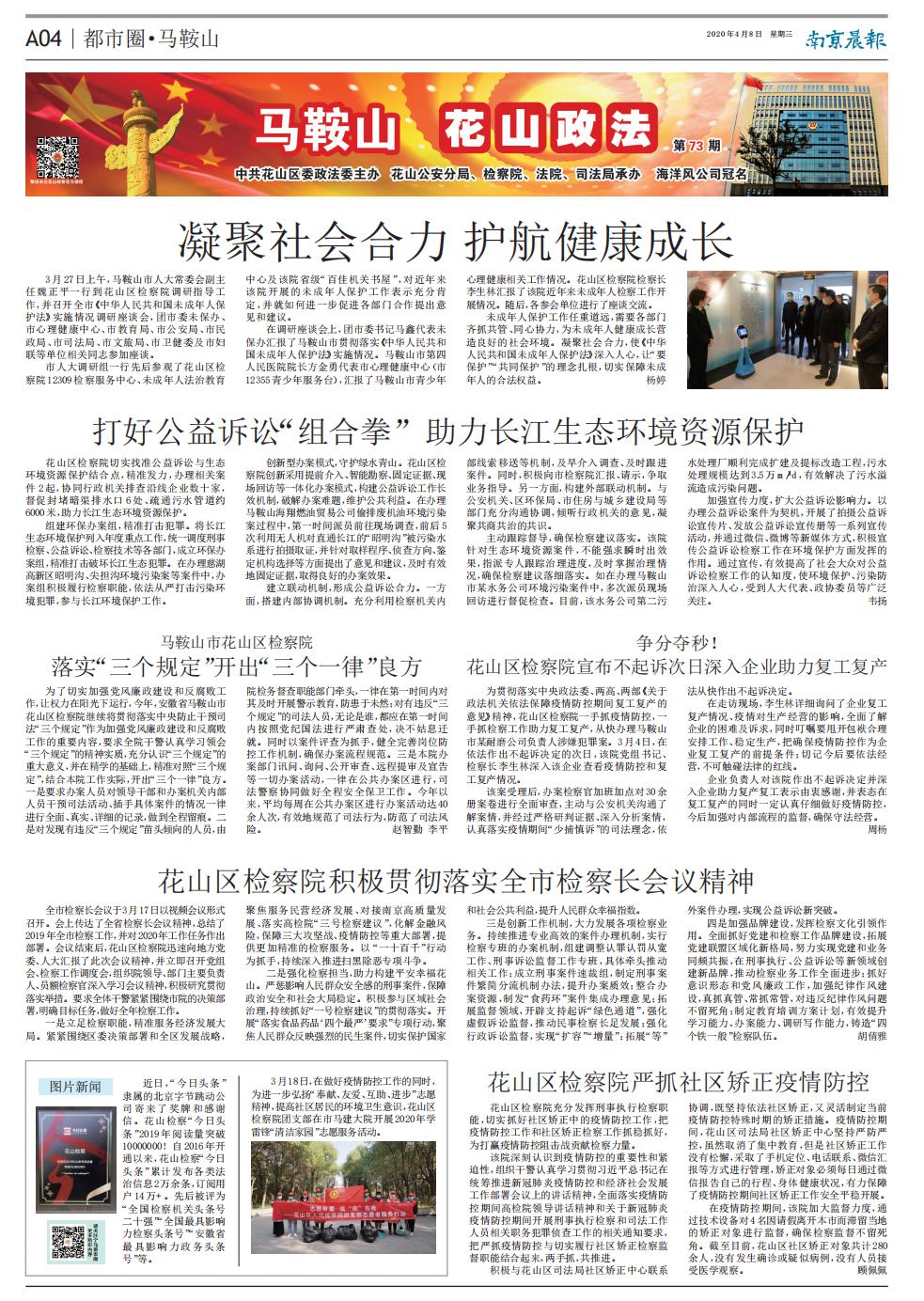 花山区检察院切实找准公益诉讼与生态环境资源保护结合点,精准发力,办理相关案件 2起,协同行政机关排查沿线企业数十家,督促封堵暗渠排水口6处、疏通污水管道约6000米,助力长江生态环境资源保护。