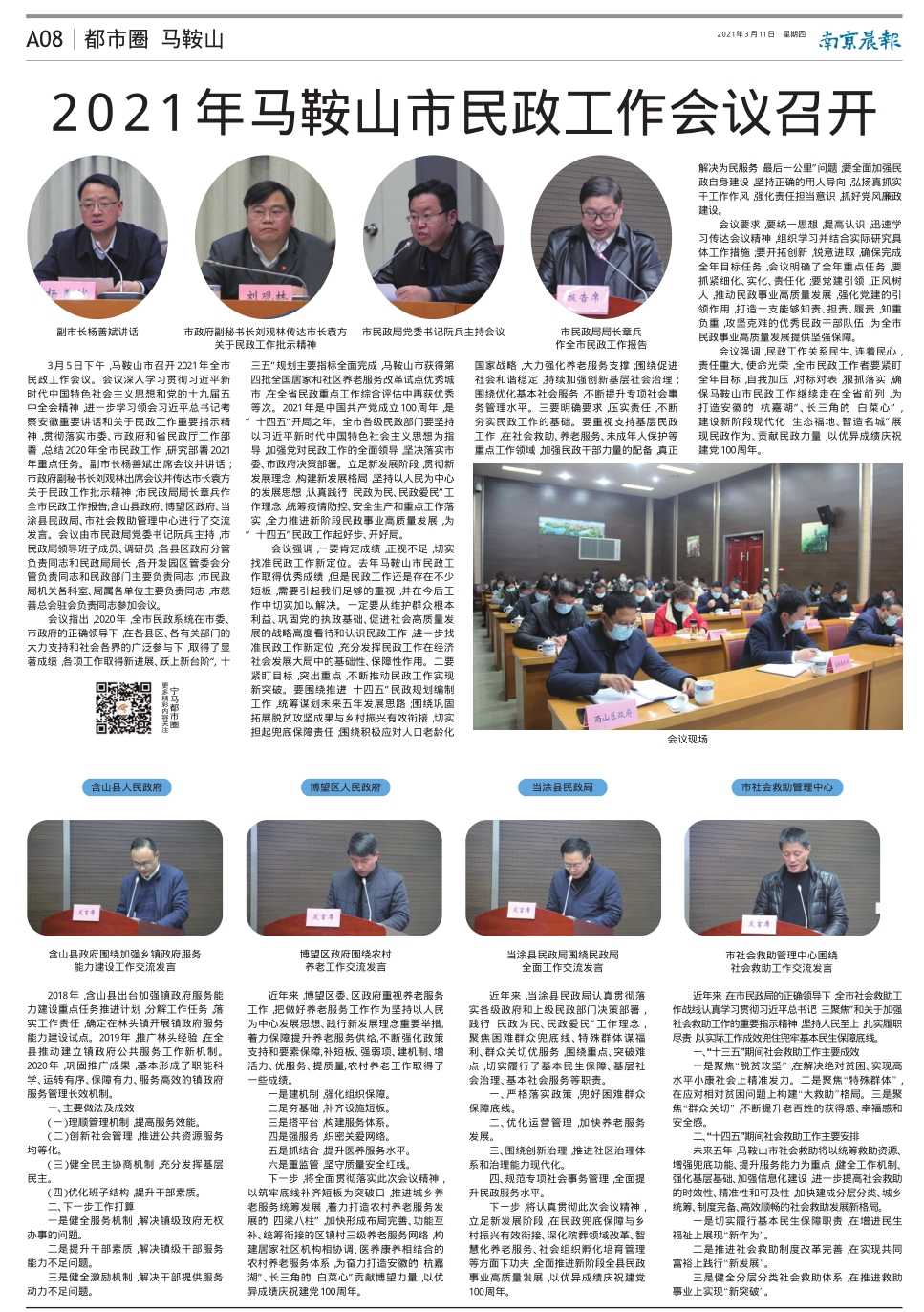 3月5日下午,马鞍山市召开2021年全市民政工作会议。会议深入学习贯彻习近平新时代中国特色社会主义思想和党的十九届五中全会精神,进一步学习领会习近平总书记考察安徽重要讲话和关于民政工作重要指示精神,贯彻落实市委、市政府和省民政厅工作部署,总结2020年全市民政工作,研究部署 2021年重点任务。市政府副市长杨善斌出席会议并讲话;市政府副秘书长刘观林出席会议并传达袁方市长关于民政工作批示精神;市民政局局长章兵作了全市民政工作报告;含山县政府、博望区政府、当涂县民政局、市社会救助管理中心进行了交流发言。会议由市民政局党委书记阮兵主持,市民政局领导班子成员、调研员;各县区政府分管负责同志和民政局局长,各开发园区管委会分管负责同志和民政部门主要负责同志;市民政局机关各科室、局属各单位主要负责同志,市慈善总会驻会负责同志参加会议。