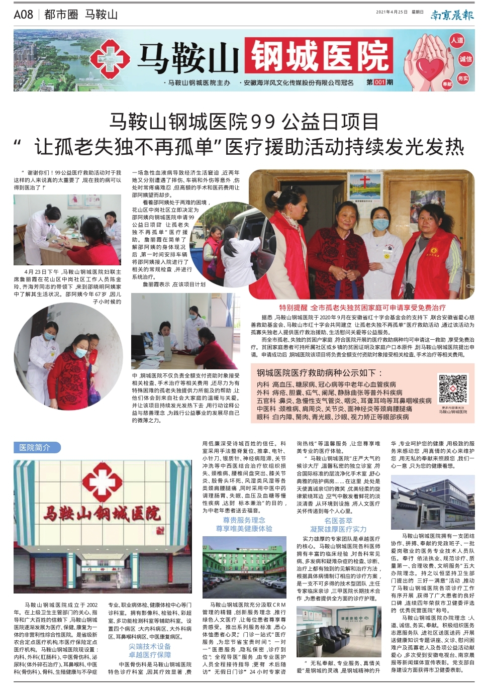 据悉,马鞍山钢城医院于2020年9月在安徽省红十字会基金会的支持下,联合安徽省爱心慈善救助基金会、马鞍山市红十字会共同建立“让孤老失独不再孤单”医疗救助活动,通过该活动为孤寡失独老人提供医疗救治援助、生活慰问关爱等公益服务。