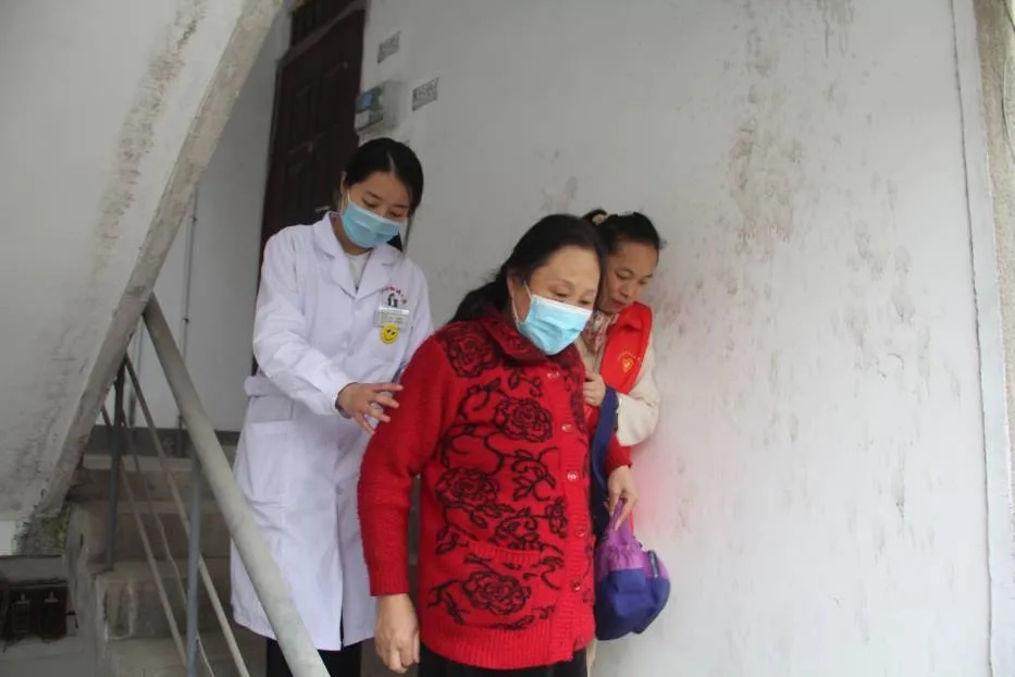 马鞍山钢城医院妇联主席詹丽霞(右二)与社区志愿者接邵阿姨(右三)去医院做检查