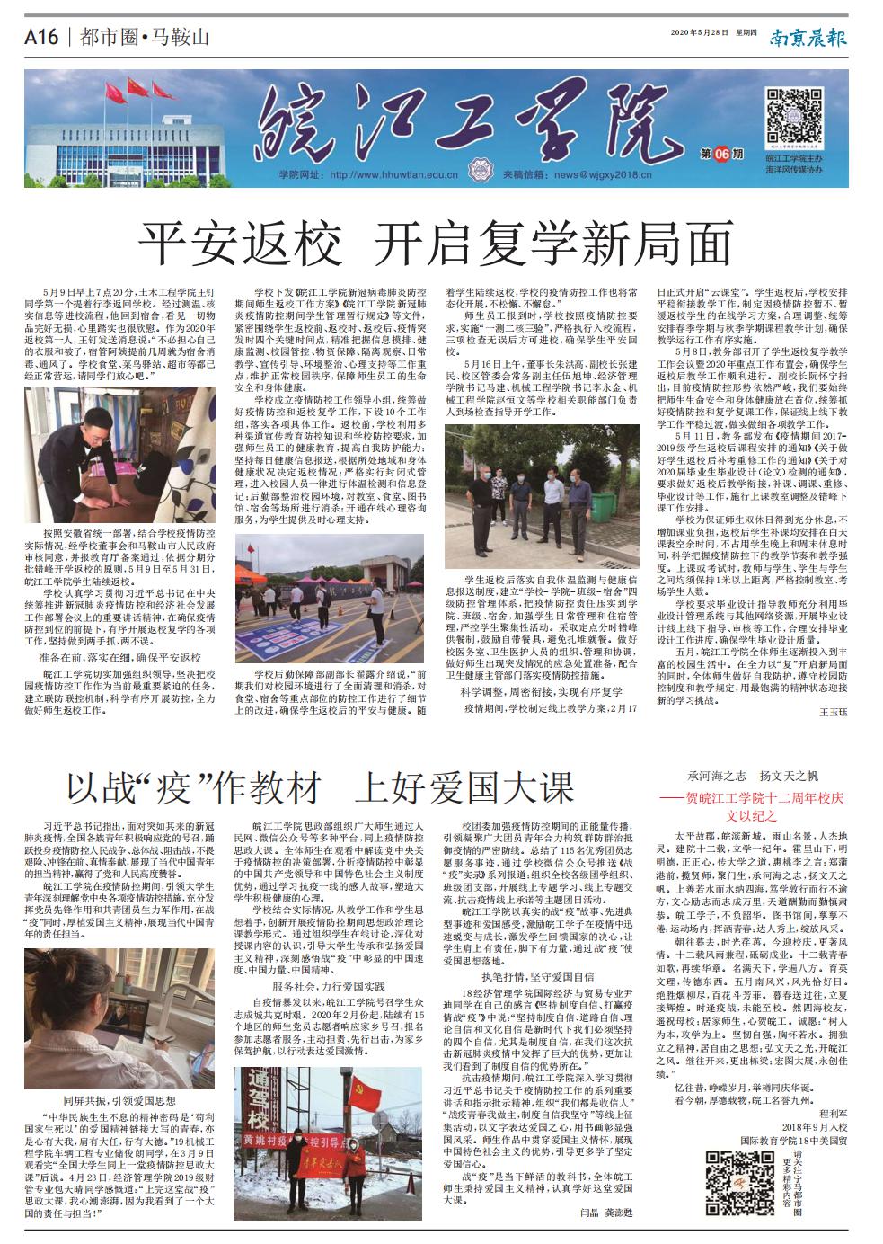 战“疫”是当下鲜活的教科书,全体皖工师生秉持爱国主义精神,认真学好这堂爱国大课。