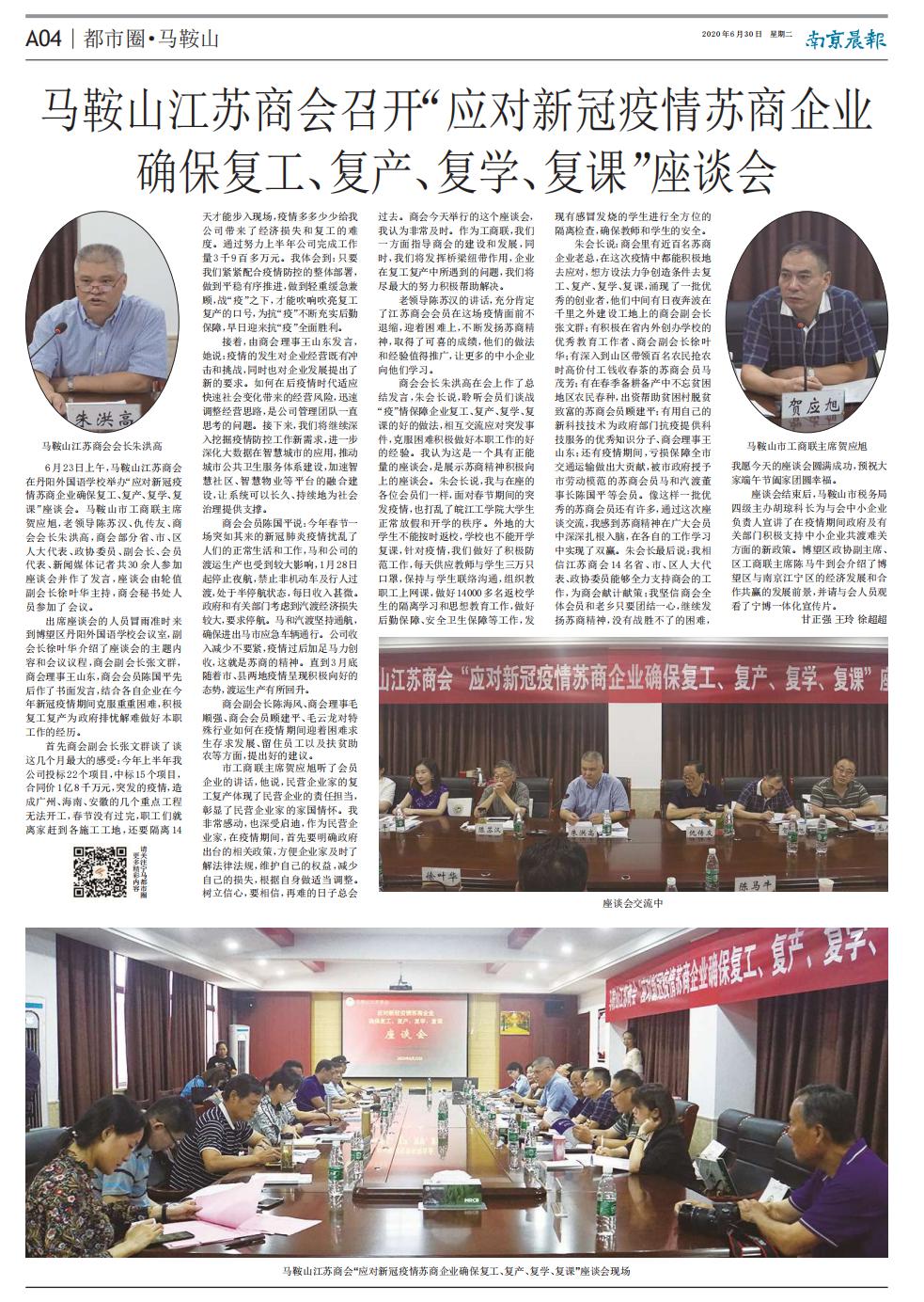6月23日上午,马鞍山江苏商会在丹阳外国语学校举办“应对新冠疫情苏商企业确保复工、复产、复学、复课”座谈会。马鞍山市工商联主席贺应旭,老领导陈苏汉、仇传友、商会会长朱洪高,商会部分省、市、区人大代表、政协委员、副会长、会员代表、新闻媒体记者共30余人参加座谈会并作了发言,座谈会由轮值副会长徐叶华主持,商会秘书处人员参加了会议。