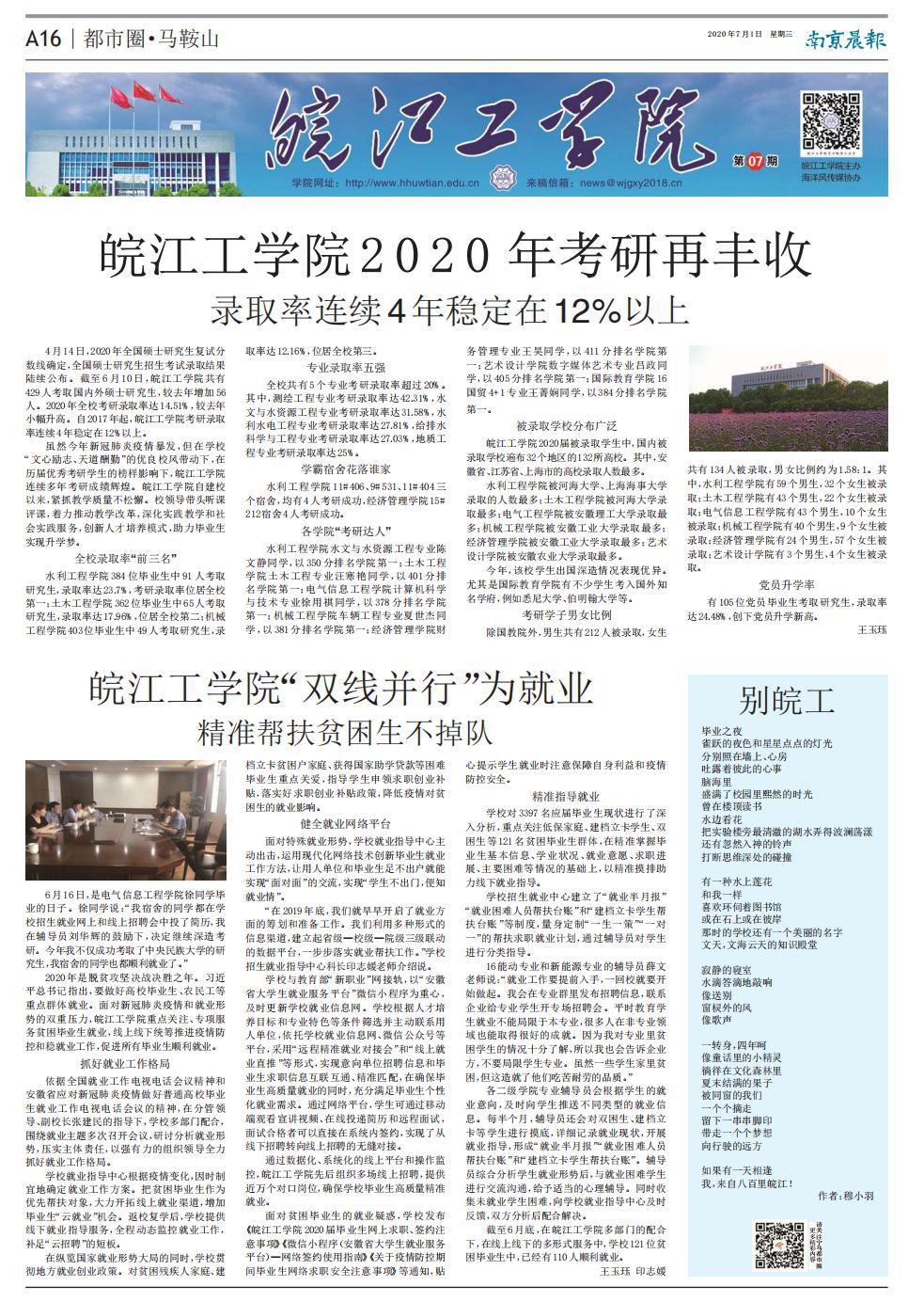 虽然今年新冠肺炎疫情爆发,但在学校“文心励志、天道酬勤”的优良校风带动下,在历届优秀考研学生的榜样影响下,皖江工学院连续多年考研成绩辉煌。皖江工学院自建校以来,紧抓教学质量不松懈。校领导带头听课评课,着力推动教学改革,深化实践教学和社会实践服务,创新人才培养模式,助力毕业生实现升学梦。