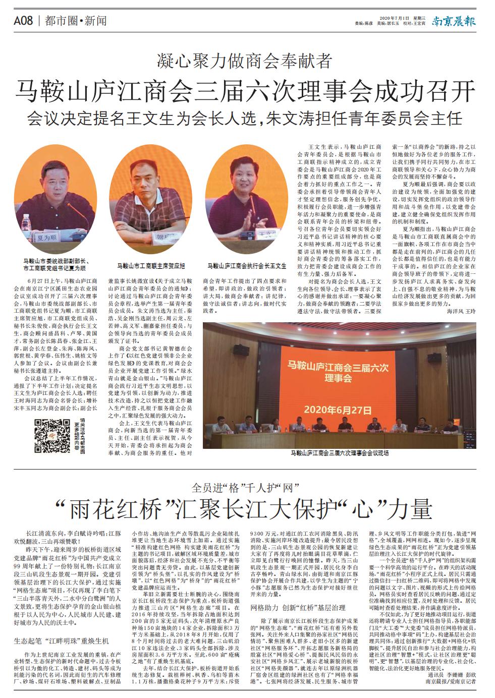 会议总结了上半年工作情况,通报了下半年工作计划;决定提名王文生为庐江商会会长人选;聘任王时海同志为商会名誉会长;增补宋丰玉同志为商会副会长;副会长兼监事长姚溦宣读《关于成立马鞍山庐江商会青年委员会的通知》;讨论通过马鞍山庐江商会青年委员会章程,选举产生第一届青年委员会成员。朱文涛当选为主任,秦浩、吴金刚当选副主任,周云龙、左若婵、高义军、蒯嘉豪担任委员,与会领导向当选的青年委员会成员颁发了证书。