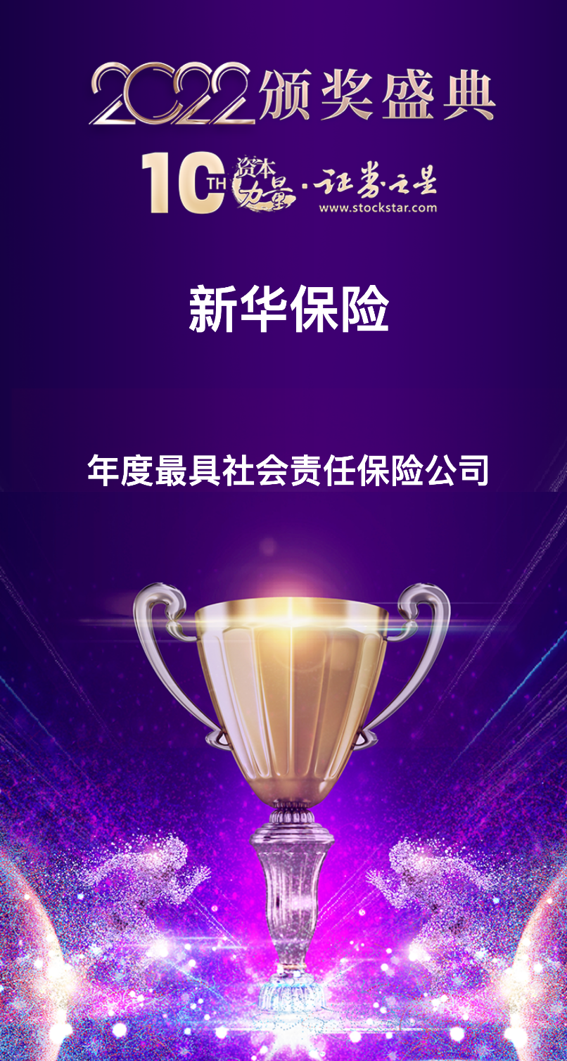 2022年11月8日,由证券之星主办的“资本力量”2022年度评选活动圆满落幕,新华保险荣获“最具社会责任保险公司”奖项。
