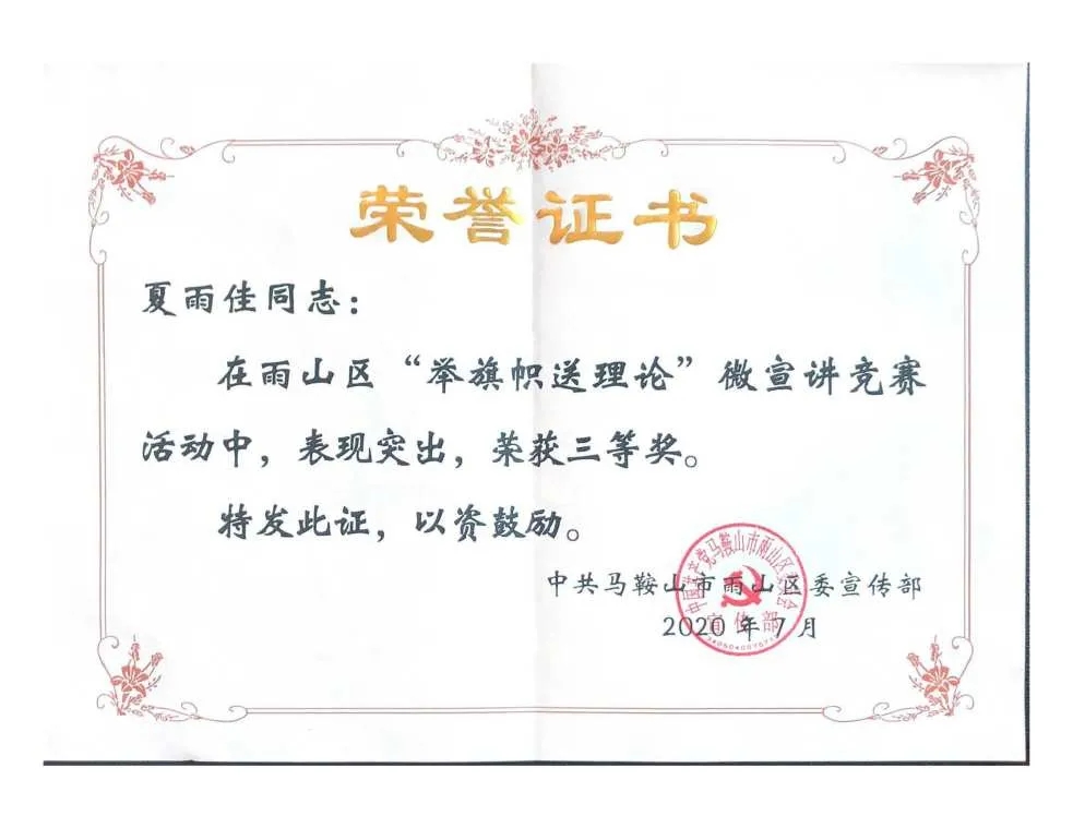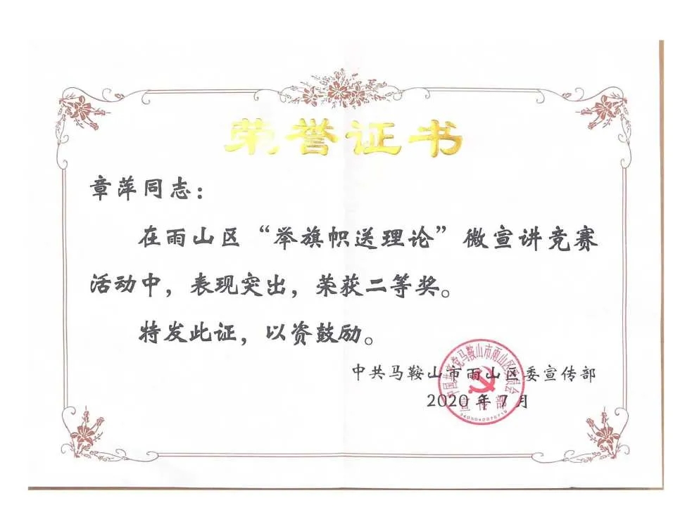 雨山区人民检察院检察人员章萍、夏雨佳在雨山区“举旗帜送理论”微宣讲竞赛活动中,表现突出,分别荣获二等奖、三等奖。
