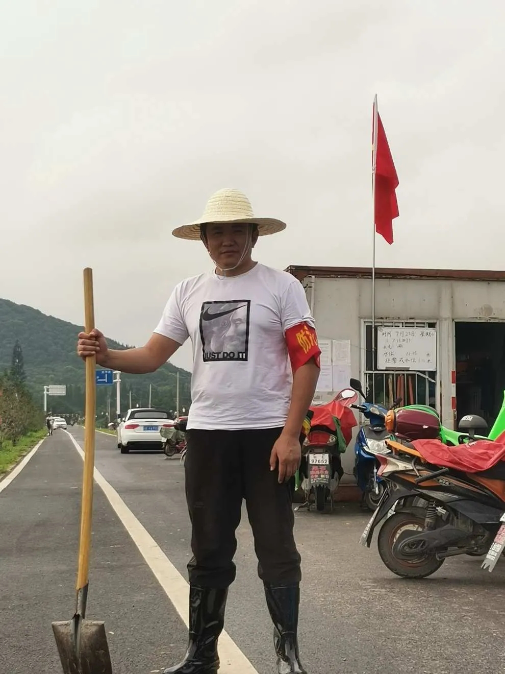 土桥点的人员由附近村民和招募志愿者组成,负责巡查采石河该临江段河堤。同其他各点一样,我们按照统一的指挥,每六人为一组,沿着河堤外坡一字排开,持铁锹向前一步一步严密排查,严防任何一处管涌、坍塌的险情。大家分多组轮番上阵,日夜不断,努力确保哪怕再小的一处渗漏。有时候最原始的方法恰能产生最良好的效果,科技手段越是进步越需要保持高度的责任心。但这种工作显然是单调乏味的,一天中数次低头往返于短短的几公里河坡,不经意间便有些松懈,不过大家都会互相提醒或说个笑话提提神,绝不会不放过一个细微的危险之处;多变的风云总不安分,不时会倾下一阵淋头急雨,让人猝不及防,然而这倒是会带来了一份意外的畅快淋漓,恰恰在枯燥中增添来几分趣味;最难耐的大概是云收日出时,伏天的炎阳露出她的本来面目,将湿漉漉的防汛队员,晒的皮肤焦灼、热气蒸腾,有白皙娇嫩者便免不了脱皮掉肉了。三日一个周期下来,有人便面如包公,长期的美白努力一朝尽毁,所幸意外获得了一份减肥的效果,也算是不虚此行吧。